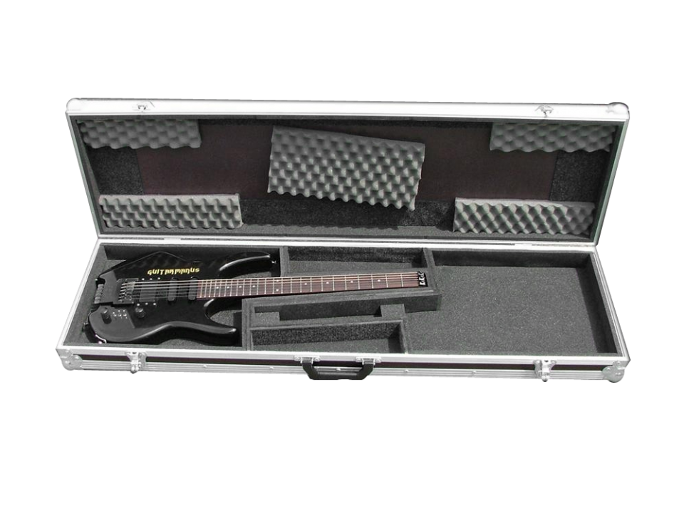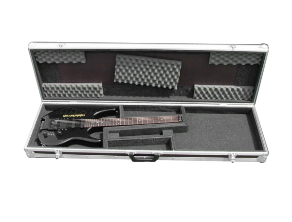 Kejs na 2 gitary bezgłówkowe, każda w osobnej przegrodzie. 2 mniejsze przegrody do zagospodarowania. Całość wyklejona gąbką, przegrody kocykiem. Na klapie przyklejona gąbka dla docisku i zapobieganiu przemieszczania się zawartości.